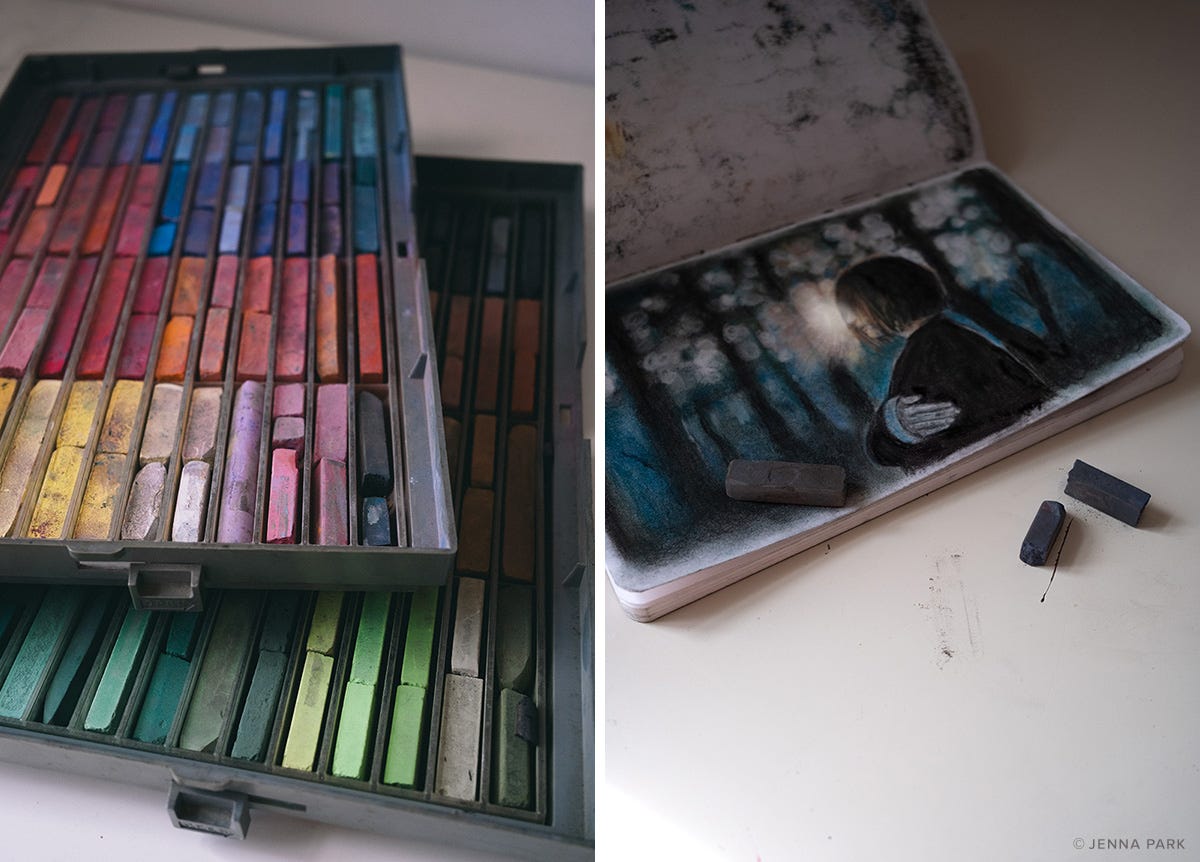 Have you ever cooked a feast or even just an ordinary meal and then was not hungry enough to eat because you’d been around food all day? Like you inhaled it through osmosis by proximity? It’s similar to when you’re hosting a party and realize by the end that you were too busy running around to eat. I filled my time with illusions of progress. Reading about making art, going to see art, watching videos of other people make art. Hoarding supplies and taking periodic inventory. Accomplices to procrastination. These are all ploys to trick yourself into an illusion of productivity because it feeds your starving soul with just enough crumbs.