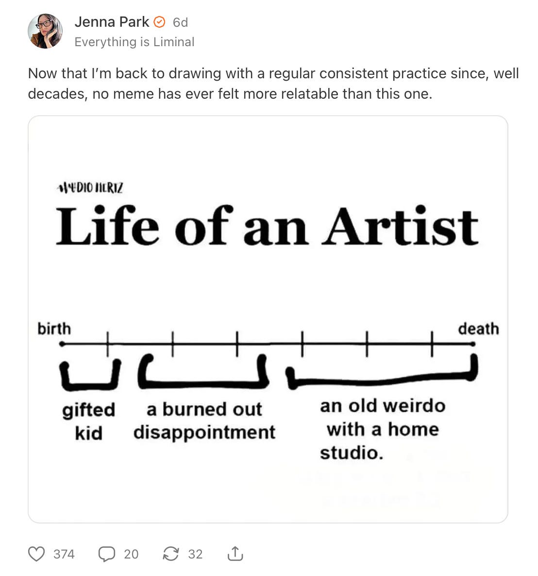 My art right now is still very much observational. It’s not that I even think that my final form as an artist lies in these sketches and studies. I have loftier ambitions of what I hope to make someday, but until I’m ready for the next leap, I’m having fun. Sharing some of my art feels ok now too. I have gotten so much joy and inspiration from discovering other artists, and seeing their work in my feed—an intentional fine-tune of my algorithm—made me want to join in on the fun.